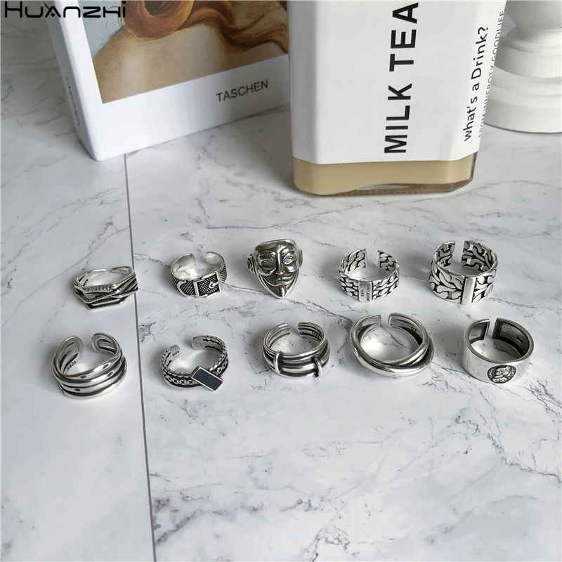 Name: HUANZHI 2020 humano cara multicapa anillos con letras Irregular Cadena de plata tibetana Retro anillo estilo Punk joyería para hombres y mujeres