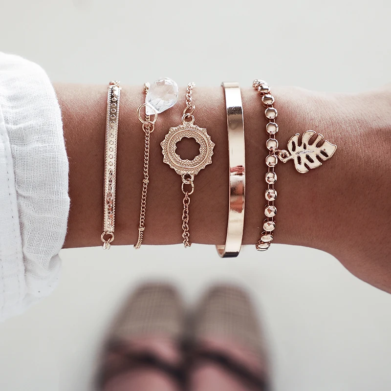 Apropiado artículo y envío urgente. vendedor recomendado para Tocona-Conjunto de 5 pulseras bohemias con hojas y Luna y abalorios dorados, joyería de acero inoxidable, Estilo Vintage, 8793